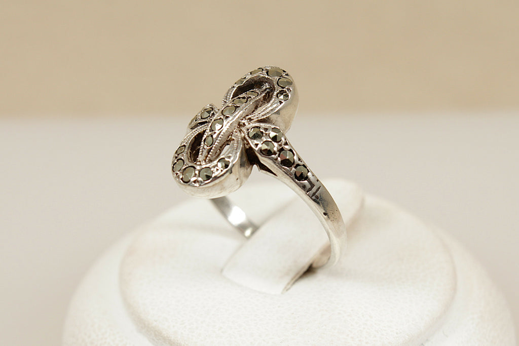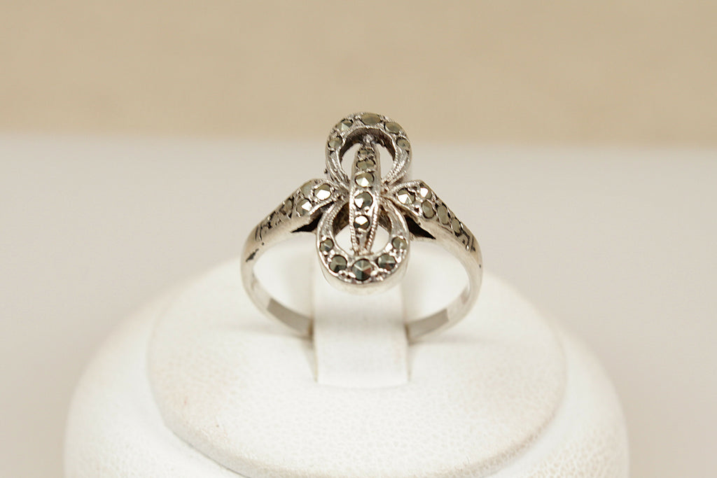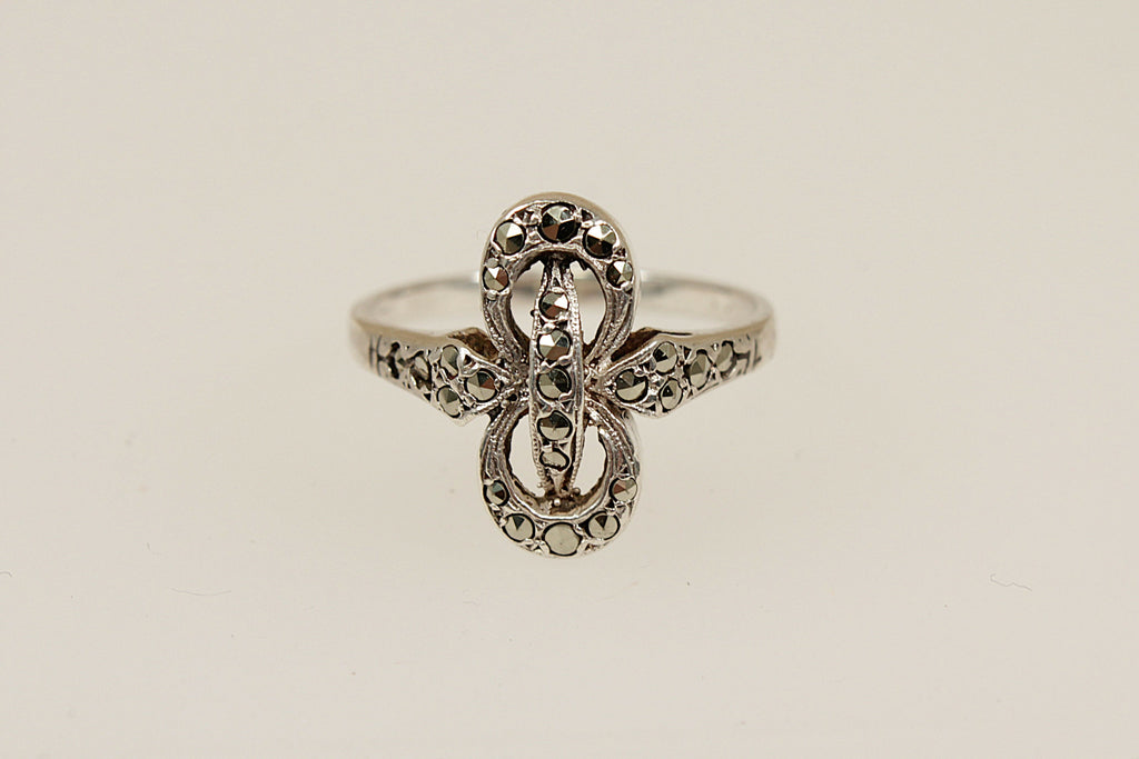 This charming Art Deco Silver ring features a classic swirling figure-of-eight design, beautifully encrusted with sparkling Marcasite stones that catch the light with every movement. Elegant and timeless in style, the ring is stamped SIL inside the band, confirming its silver content.