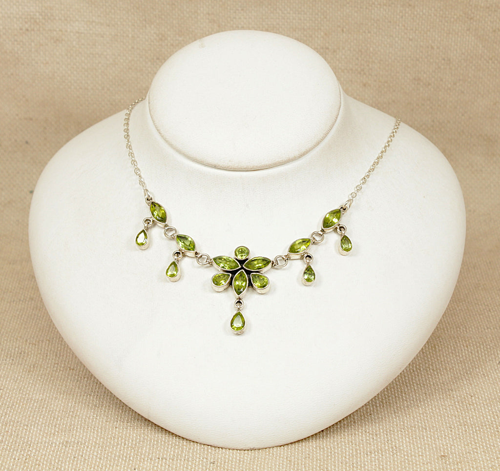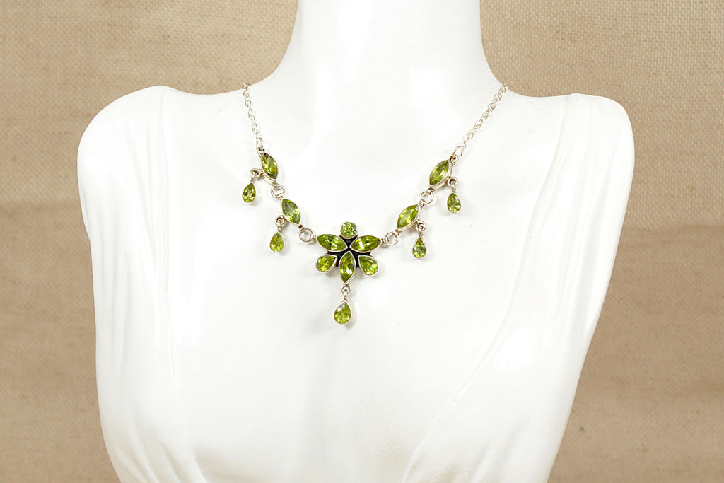 At the centre is an eye-catching dropper pendant, formed as a delicate floral arrangement of seven peridot stones. Leading up each side of the silver chains are two additional dropper formations, creating a balanced and elegant cascading effect.
