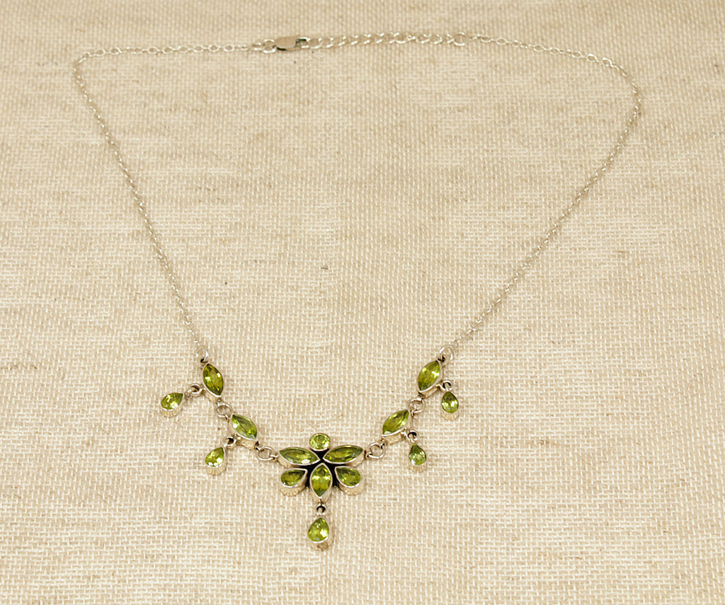This stunning Sterling Silver necklet is beautifully set with a total of 15 peridot gemstones, featuring a graceful mix of pear, marquise, and round cuts, all securely bezel set for a refined finish.