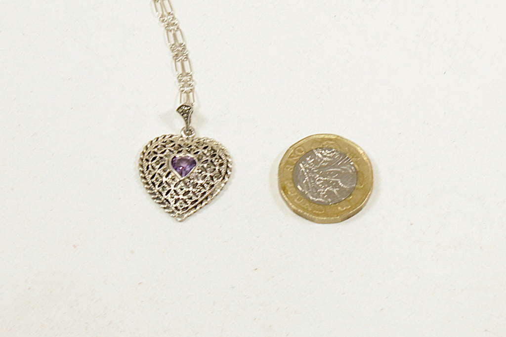 This elegant vintage Silver heart pendant is beautifully handcrafted and features a central heart-shaped Amethyst, securely bezel set as the focal point of the design. Surrounding the gemstone is intricate cut-out silverwork with a delicate scalloped edge, showcasing fine artisanal craftsmanship.