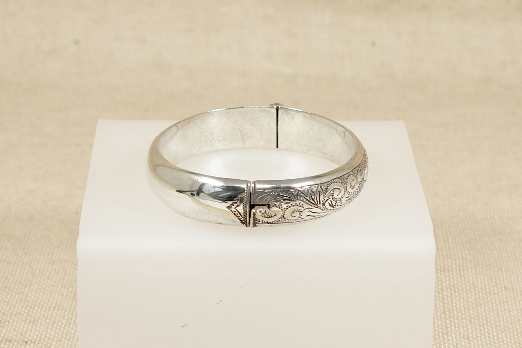 This classic vintage Silver hinged bangle features floral-inspired etched decoration around half of the band, giving it a timeless and elegant appeal.