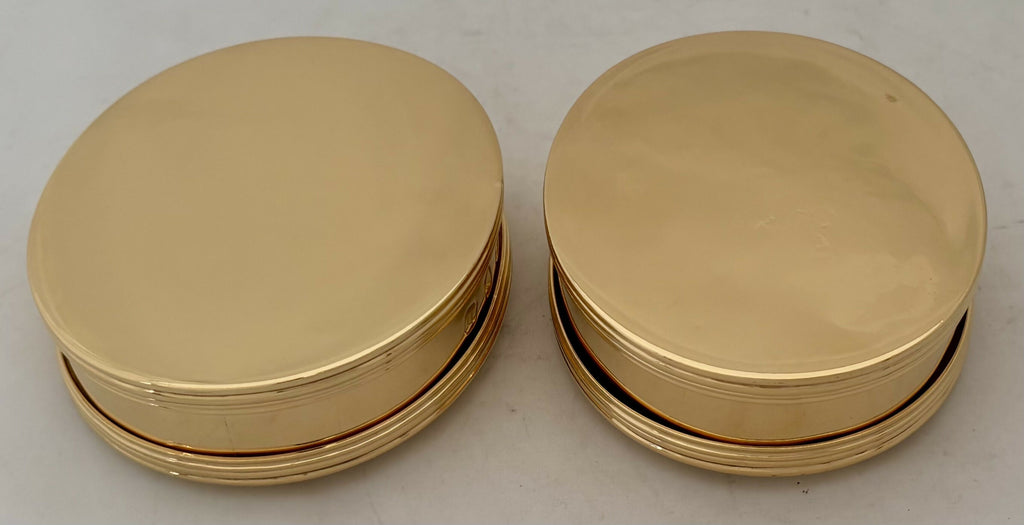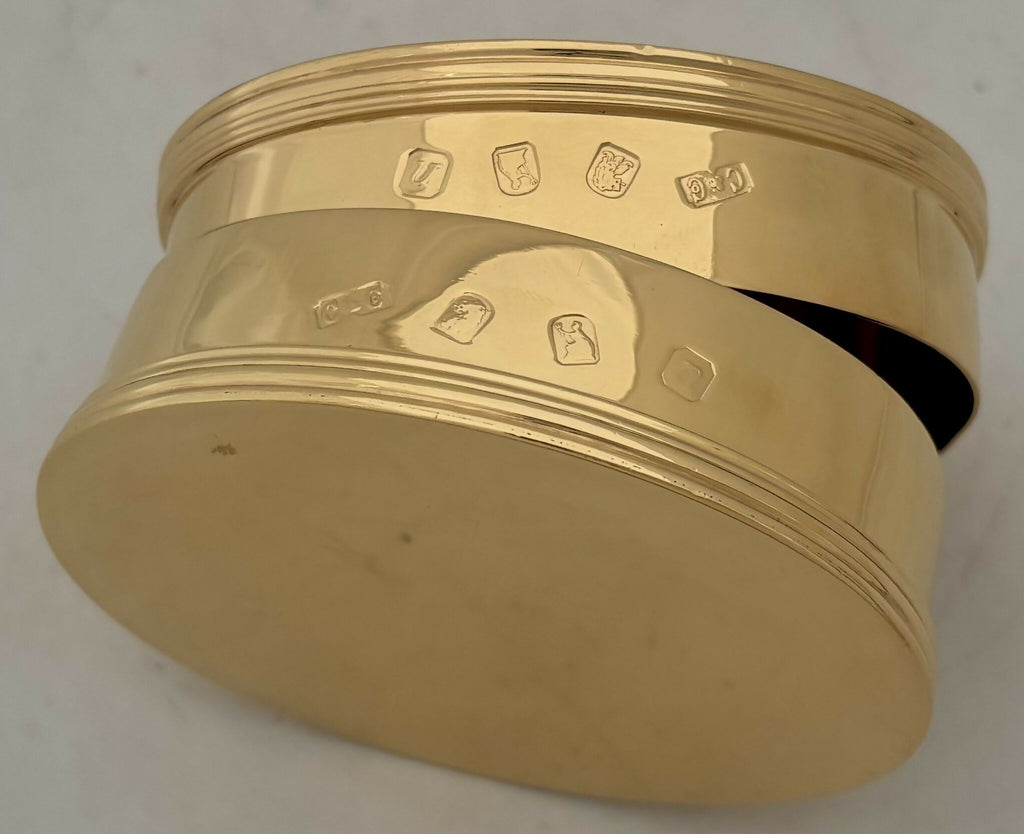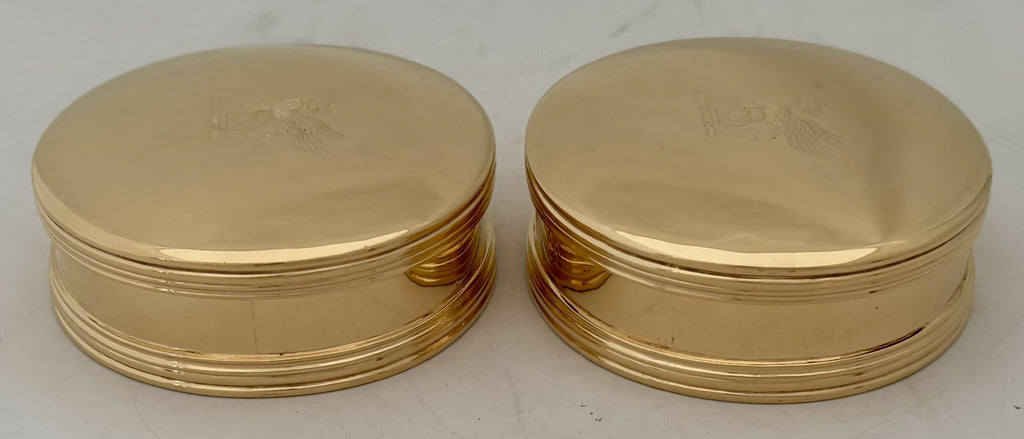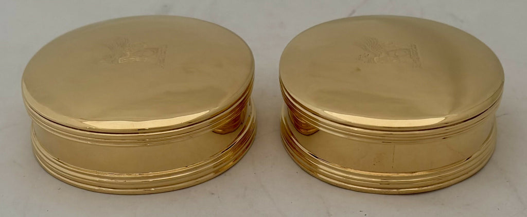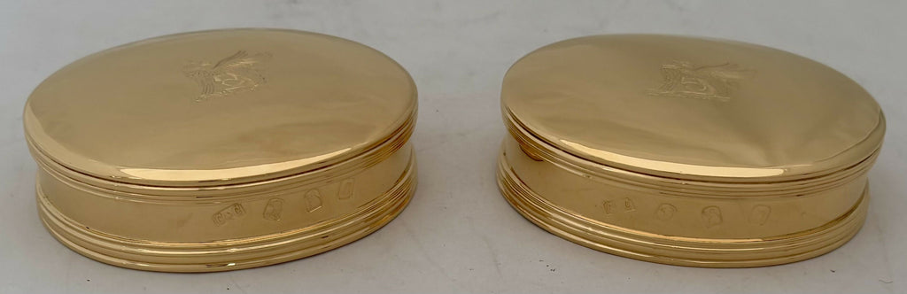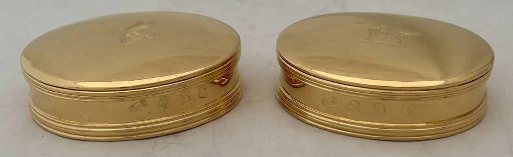 A Pair of George I Style Silver Gilt, Britannia Standard, Crested Oval Tobacco Boxes. Of oval form with reeded detail and free of any inscriptions.