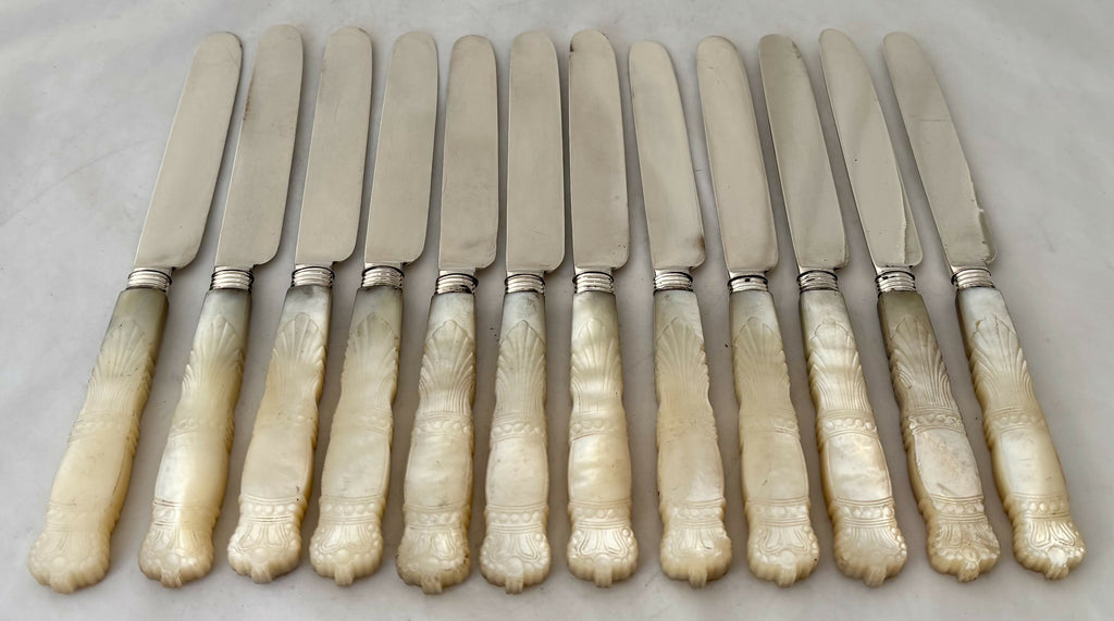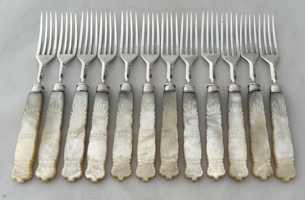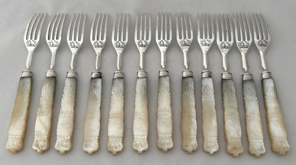A William IV Rosewood Cased Set of Crested Silver and Mother of Pearl Dessert Knives and Forks for Twelve. The mother of pearl with carved crown terminals, possibly for the 1831 Coronation of William IV.